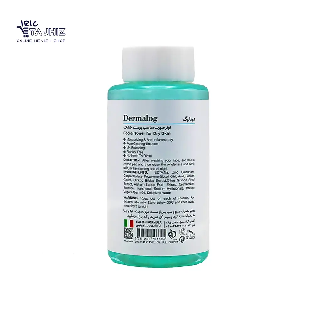 تونر صورت پوست خشک درمالوگ به تنظیم و متعادلسازی pH طبیعی پوست کمک کرده و از بههمخوردن تعادل پوست پس از شستشو جلوگیری میکند.